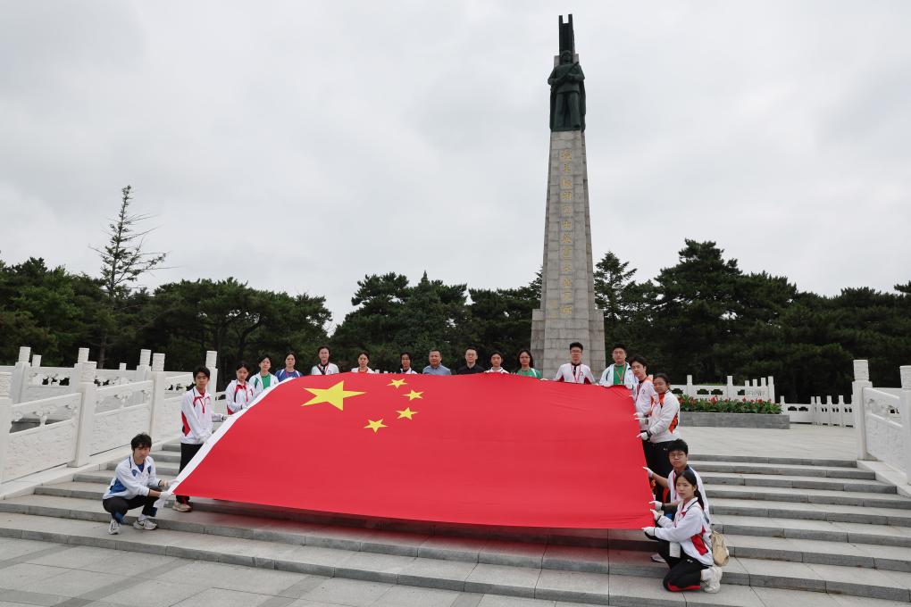 7月2日,在沈阳的抗美援朝烈士陵园,香港培侨中学的师生在纪念碑前展示五星红旗。新华社记者 李钢 摄
