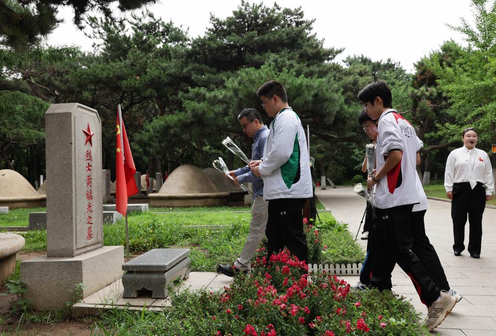 7月2日,在沈阳的抗美援朝烈士陵园,香港培侨中学校长伍焕杰和学生一起向烈士墓献花。新华社记者 李钢 摄