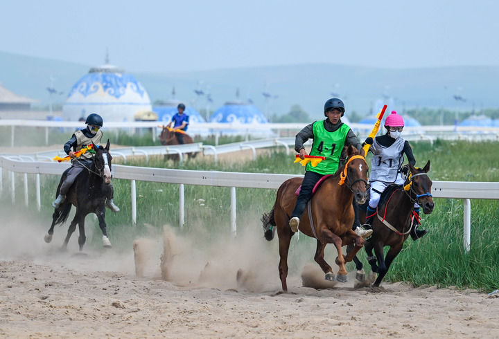 6月28日,骑手们在赛马比赛中进行激烈角逐。新华社记者 彭源 摄