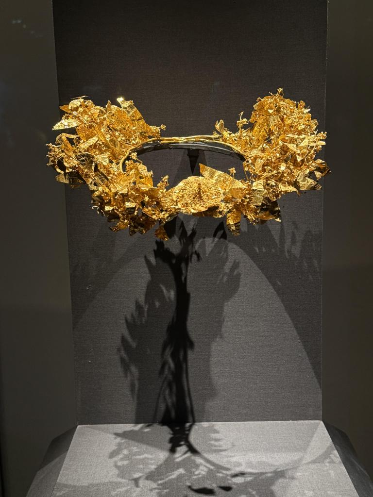 一副是从爱琴海而来的迈锡尼金面具,在闪动的海蓝色灯光下熠熠生辉,肃穆的胡须轮廓闪耀着古希腊文明的荣光;另一副是古蜀黄金面具,在黄金与青铜的光泽里,诉说着古蜀文明的神秘传奇。