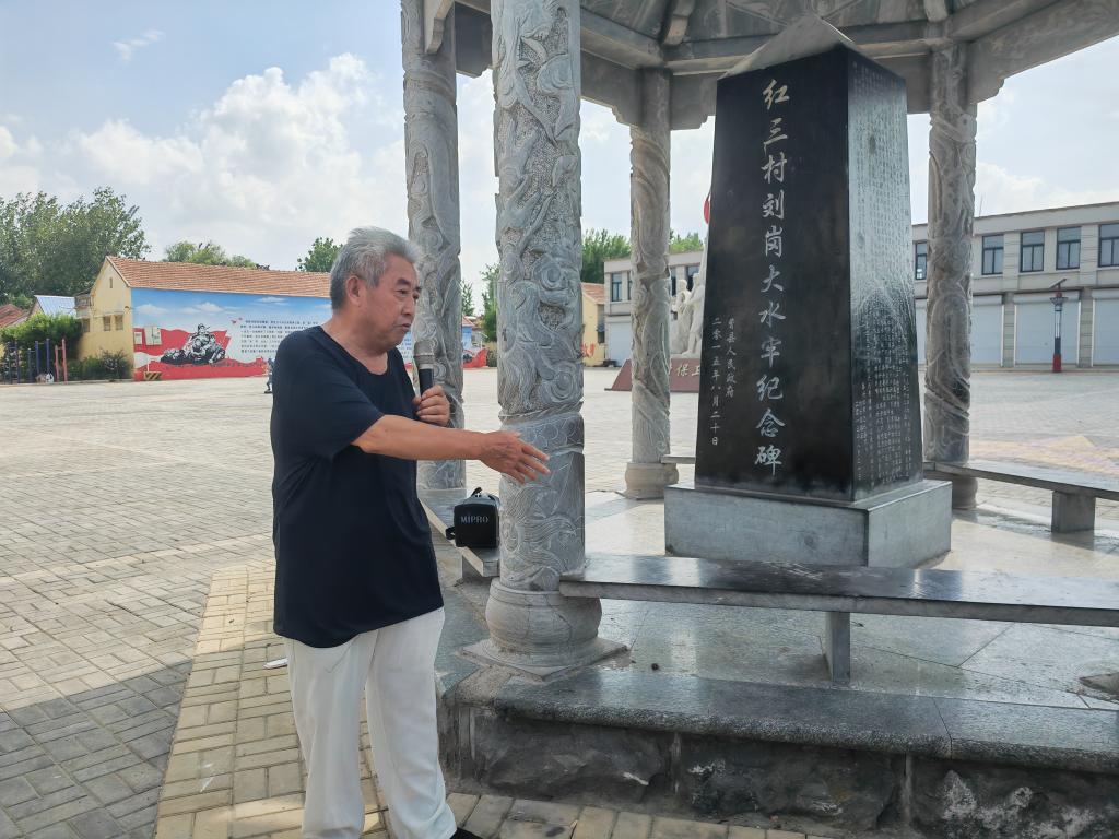 “1943年,日军突袭刘岗村,严刑逼迫村民说出八路军的秘密。眼看村民一个个被杀,冀鲁豫边区八路军战士秦兴体站了出来,向侵略者高声反抗,义无反顾献出了生命……”在菏泽市曹县韩集镇刘岗村,74岁的义务讲解员刘全义站在刘岗大水牢纪念碑前,动情讲述着“红三村”的抗日故事。