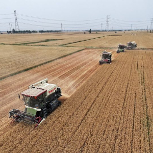 2024年6月7日,收割机在河北省邢台市隆尧县固城镇东王村麦田里收获小麦(无人机照片)。新华社记者 牟宇 摄