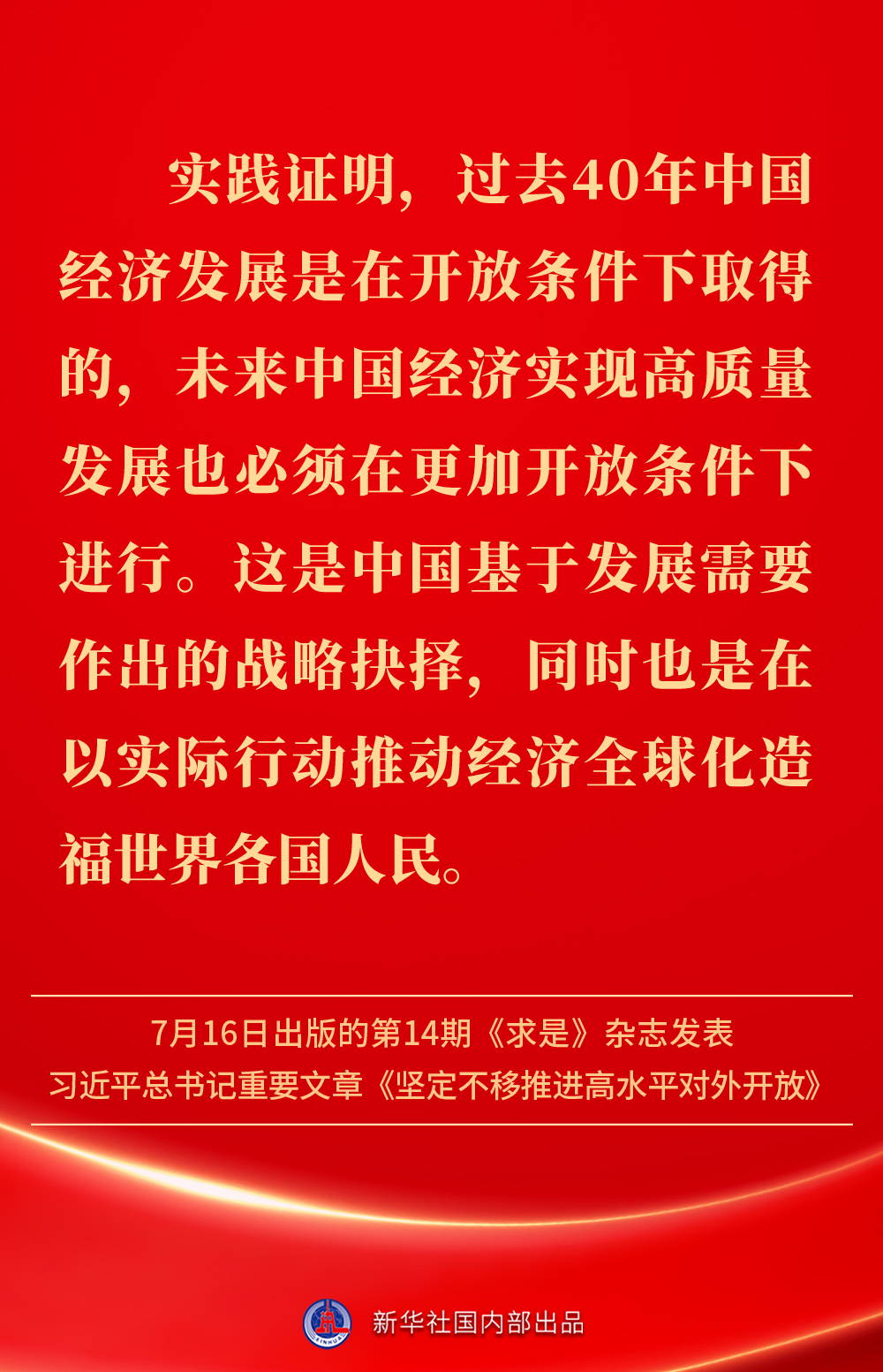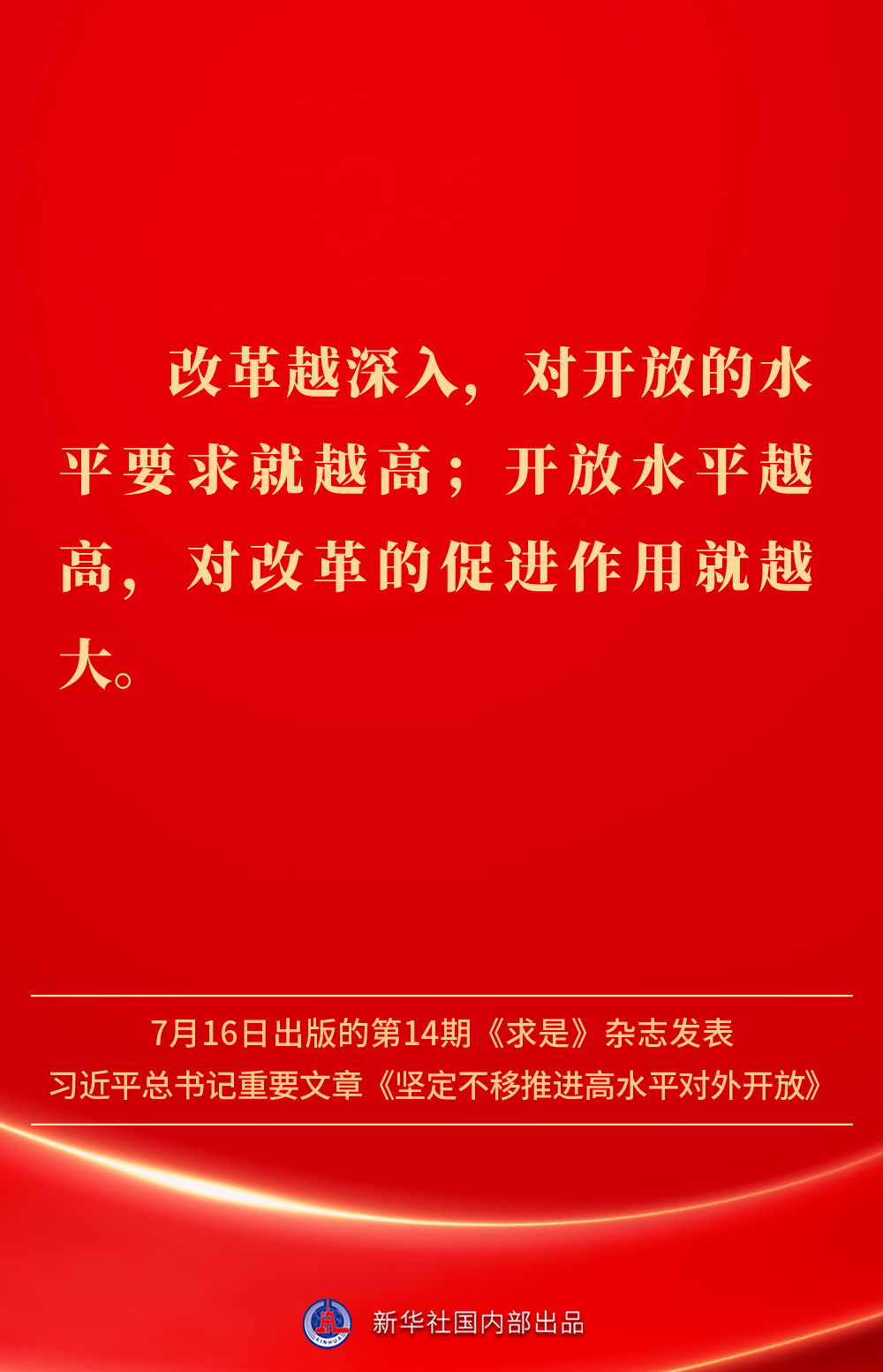 7月16日出版的第14期《求是》杂志发表习近平总书记重要文章《坚定不移推进高水平对外开放》。文章强调,中国的发展离不开世界,世界的繁荣也需要中国。不断扩大对外开放、提高对外开放水平,以开放促改革、促发展,是我国发展不断取得新成就的重要法宝。坚定不移推进高水平对外开放,总书记这样阐明——