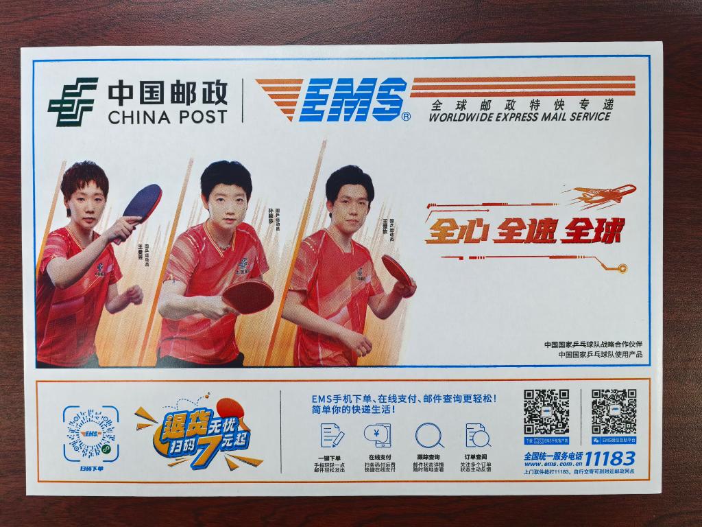 据介绍,本次发布封套的图案为王曼昱、孙颖莎、王楚钦三名乒乓球国手手持球拍的形象,将EMS与国乒形象深度融合,借三位世界冠军传递“全心全速全球”的理念。该款封套已于今年6月进行推广使用。