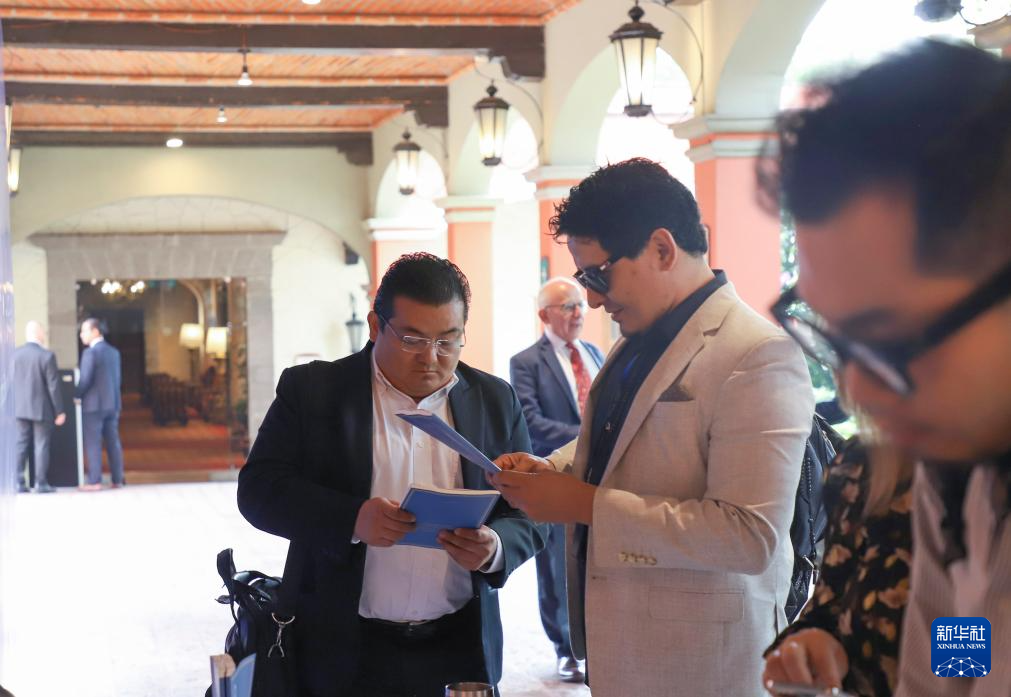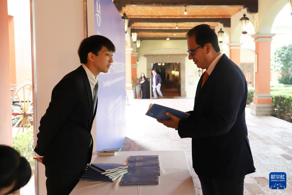 7月18日,在墨西哥首都墨西哥城,嘉宾在“红厅论坛·中墨文明交流互鉴对话会”上翻阅《在世界文化激荡中坚守文化主体性——中国式现代化发展道路的精神基石》智库报告。新华社发(弗朗西斯科·卡涅多摄)