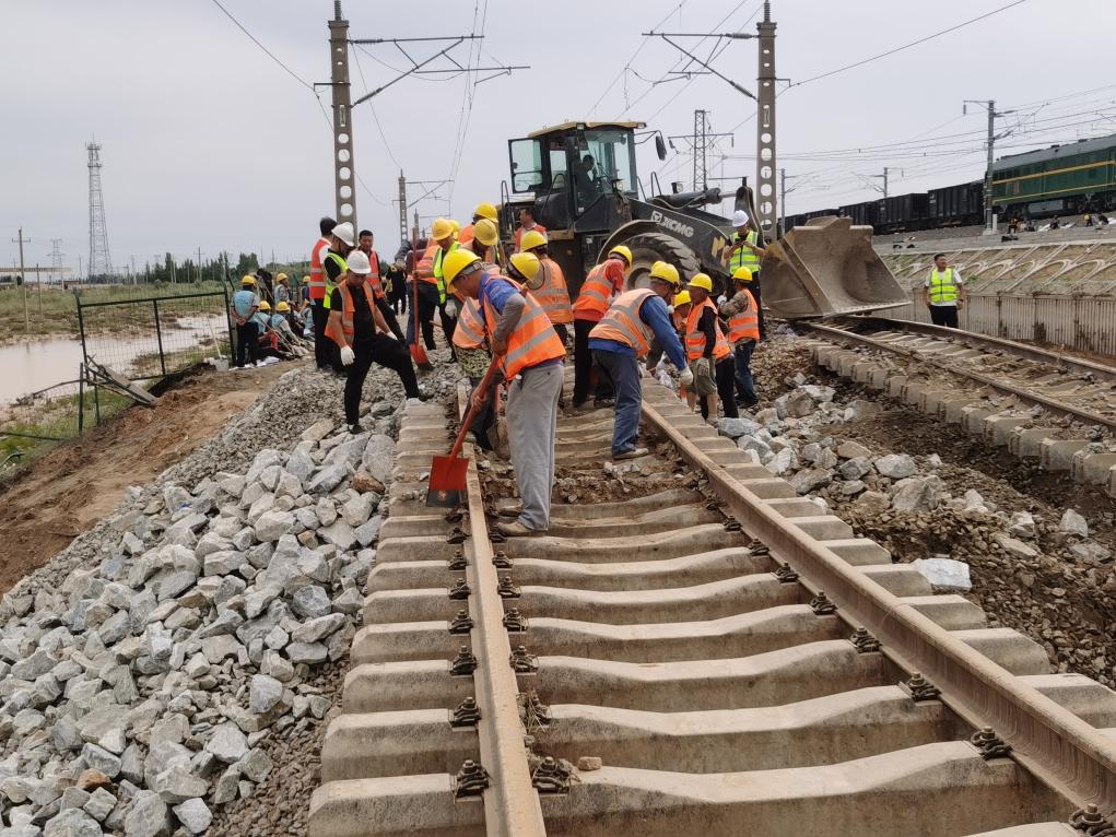 这是7月19日拍摄的包兰铁路杭锦旗站至碱柜站区间的抢险现场。(中国铁路呼和浩特局集团有限公司供图)
