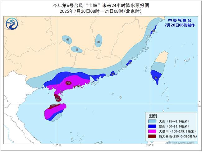 降水预报:7月20日08时至21日08时,海南岛、广东中南部、香港、澳门、广西南部、福建东部、浙江东南部、江西西南部、湖南南部、台湾岛中南部等地有大到暴雨,其中,海南岛中北部、广东西南部、香港、澳门、广西东南部沿海等地部分地区有大暴雨,海南岛北部、广东西南部沿海等地局地有特大暴雨(250~320毫米)。上述部分地区伴有短时强降水(最大小时降雨量20~50毫米,局地90~110毫米),局地有雷暴大风等强对流天气。