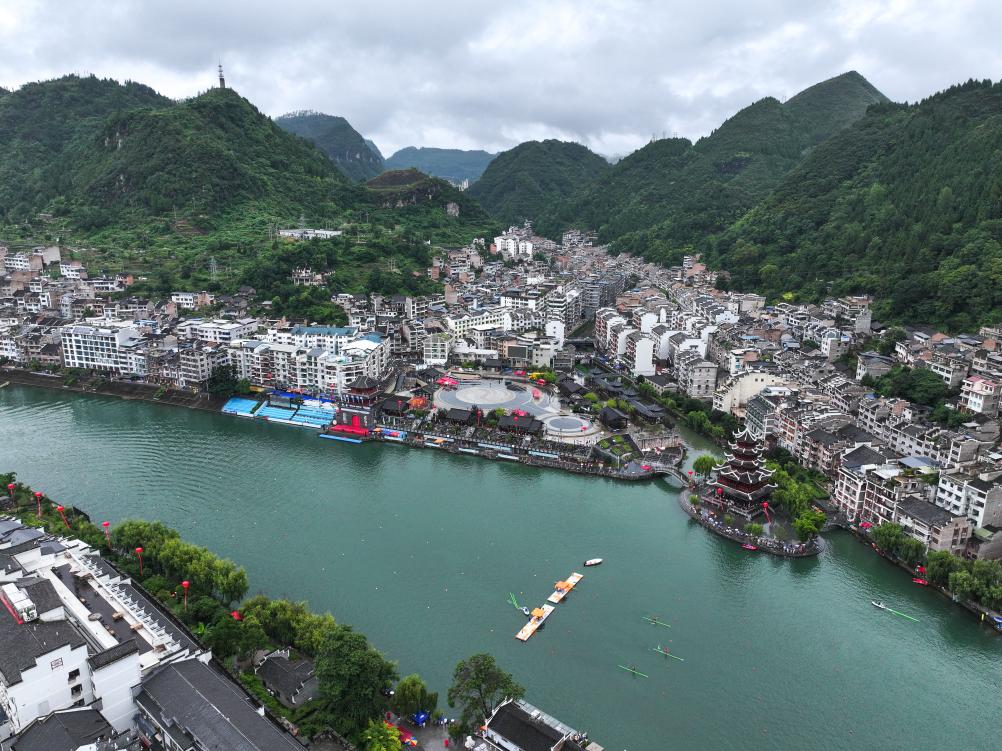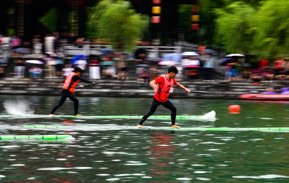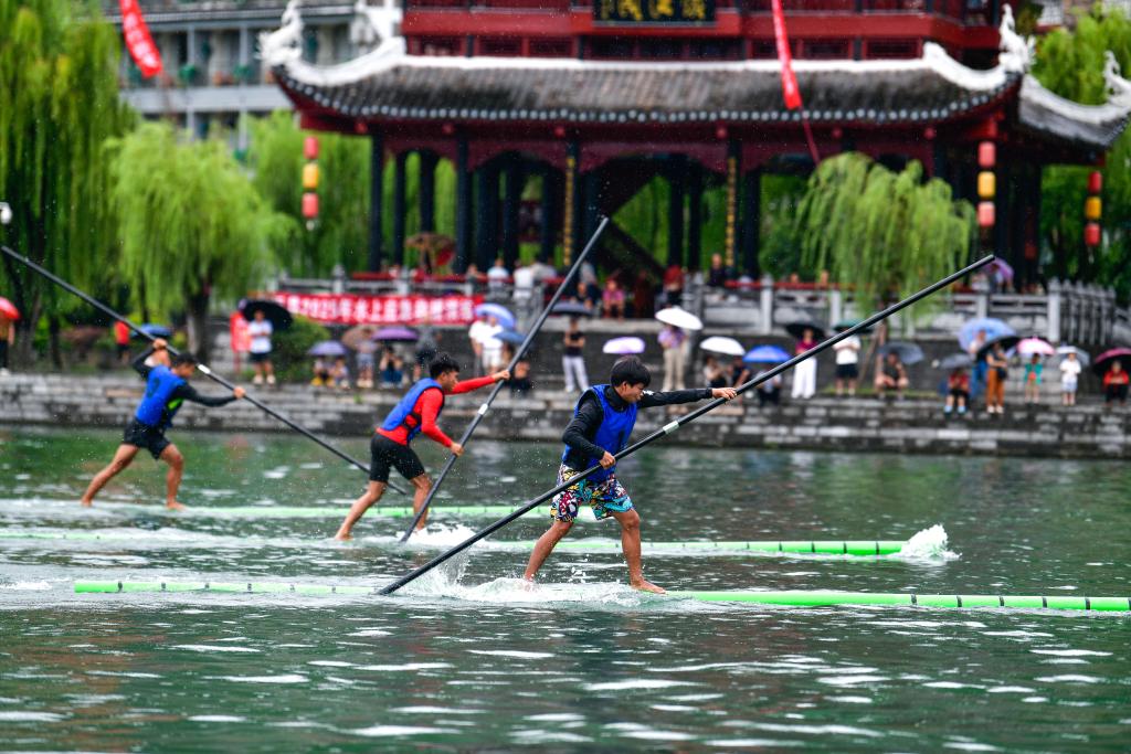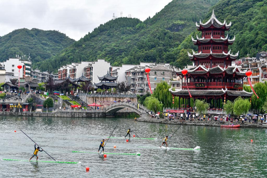 7月22日至23日,2025年民体杯全国独竹漂比赛在贵州省黔东南苗族侗族自治州镇远古城举行。来自浙江、湖北、广西、广东、贵州等省区的10支独竹漂代表队参加比赛。