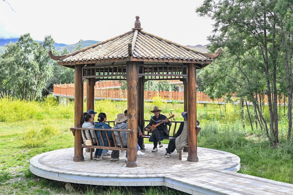 隆子县居民在沙棘林生态公园弹奏乐器。新华社记者 李鑫 摄