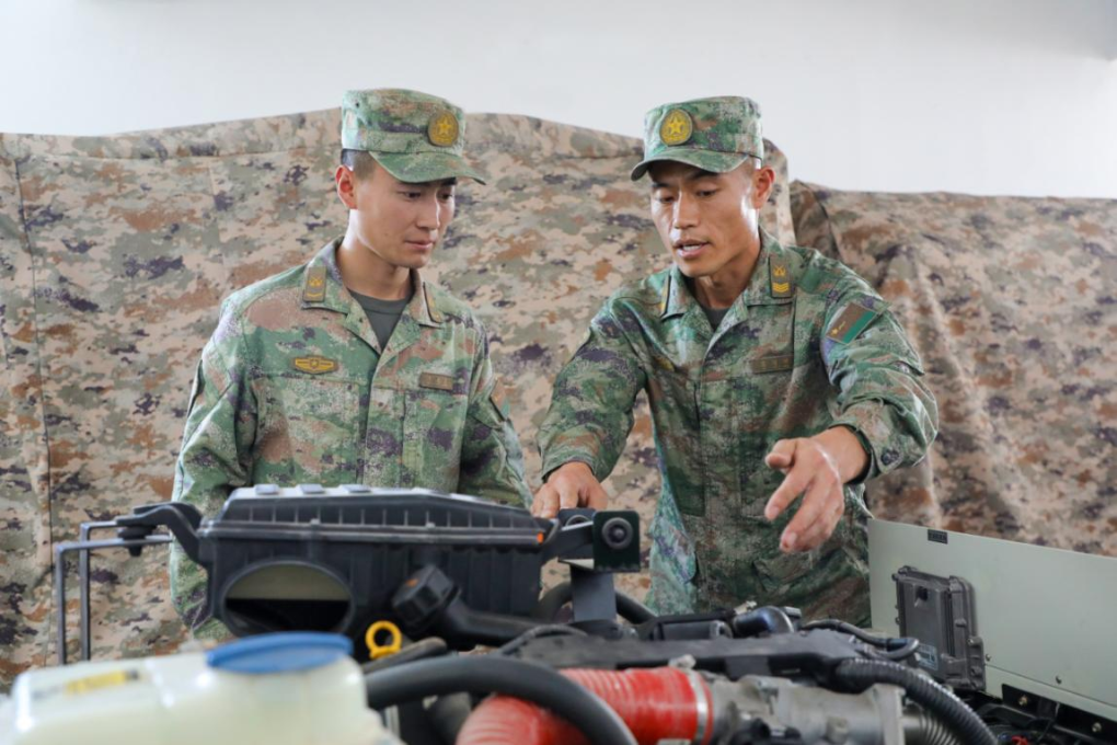 雷耀明(右)向年轻战友讲解装备保养相关知识。张翔 摄