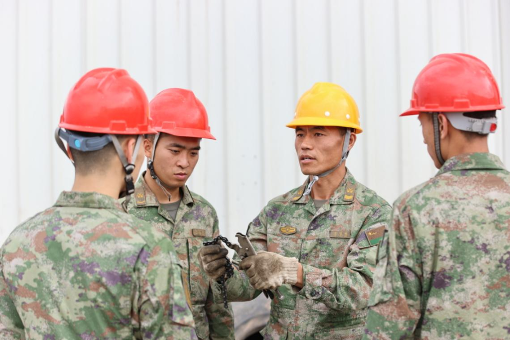 雷耀明(右二)向年轻战友讲解机具使用技巧。郑弘扬 摄