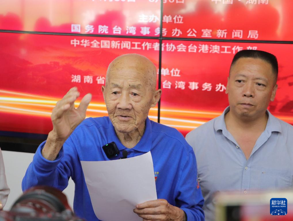 7月31日,在长沙保卫战影珠山抗战史实陈列馆,97岁的抗战老兵余炳纯(左)接受两岸记者采访。新华社记者 马欣然 摄