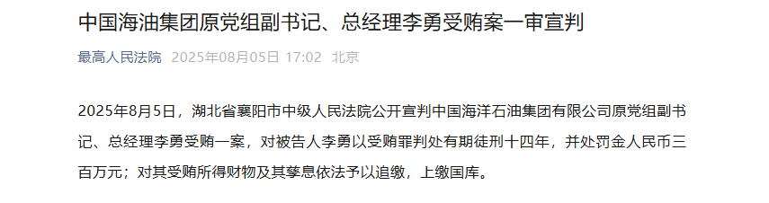 2025年8月5日,湖北省襄阳市中级人民法院公开宣判中国海洋石油集团有限公司原党组副书记、总经理李勇受贿一案,对被告人李勇以受贿罪判处有期徒刑十四年,并处罚金人民币三百万元;对其受贿所得财物及其孳息依法予以追缴,上缴国库。