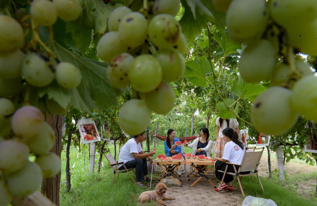 8月2日,在河南省商丘市夏邑县太平镇,人们在葡萄架下吃瓜休闲,避暑消夏。新华社发(苗育才摄)