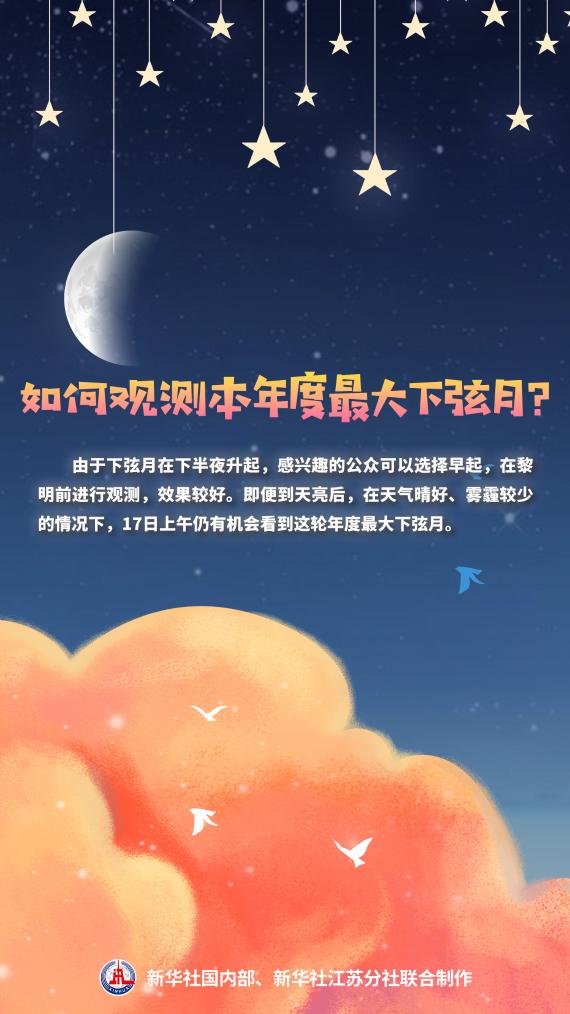 如何观测本年度最大下弦月?王科超建议,由于下弦月在下半夜升起,感兴趣的公众可以选择早起,在黎明前进行观测,效果较好。即便到天亮后,在天气晴好、雾霾较少的情况下,17日上午仍有机会看到这轮年度最大下弦月。(记者王珏玢、朱筱,海报制作:孙苏皖)