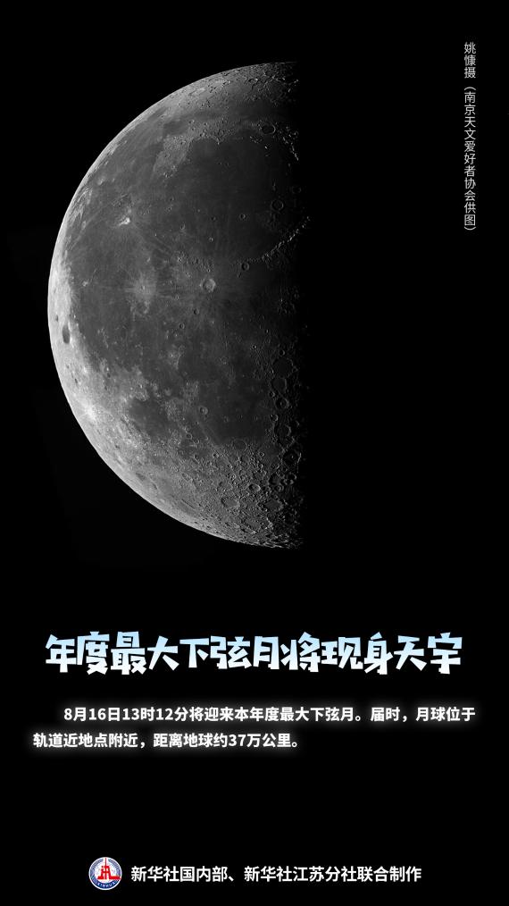 8月16日13时12分将迎来本年度最大下弦月。届时,月球位于轨道近地点附近,距离地球约37万公里。下弦月形如半轮明月,16日后半夜,人们将看到今年最大的下弦月如反写的“D”形一般悬于夜空。