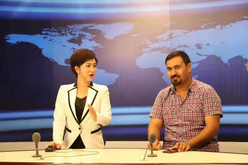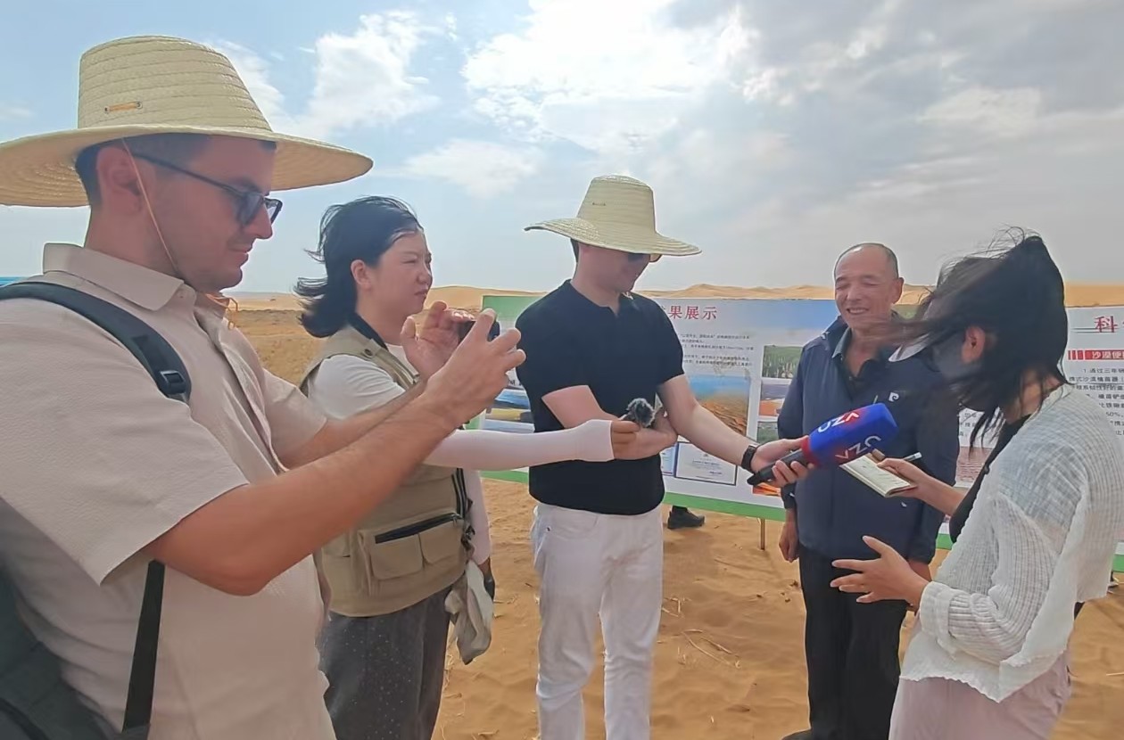 与乌兹别克斯坦主流媒体记者一起采访治沙专家唐希明