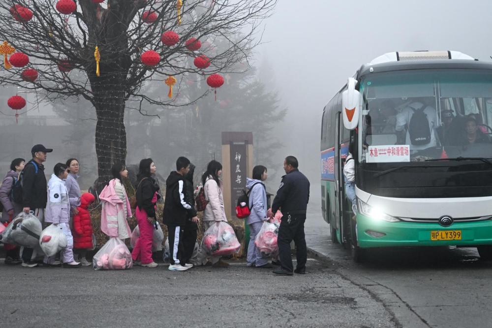 1月23日,游客在神农架中和国际滑雪场外乘坐大巴准备离开雪场。记者 杜子璇 摄