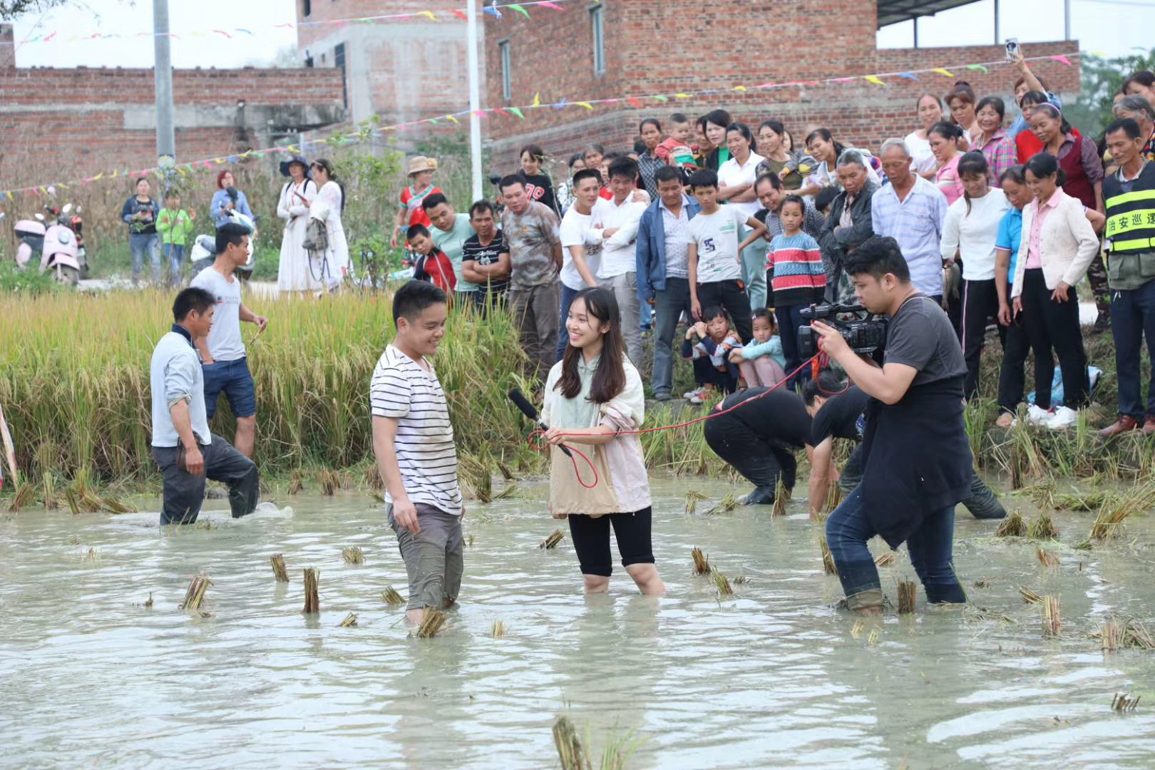 采访报道来宾市兴宾区城厢镇平洞村丰收节,游客下水捉鱼比赛