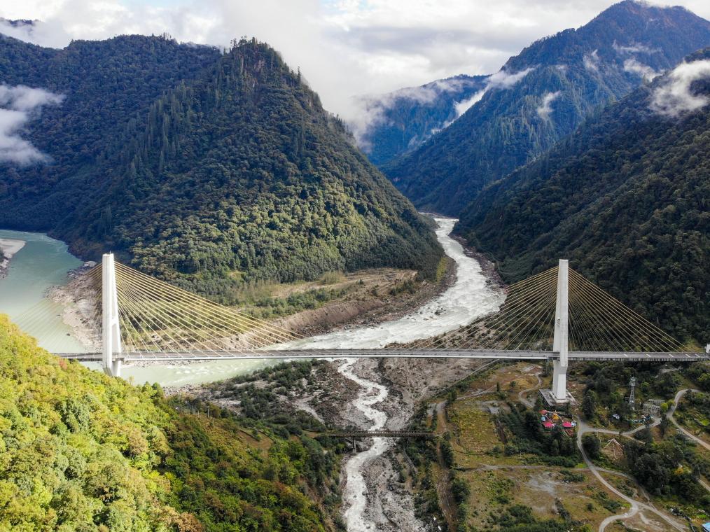 2019年10月27日拍摄的川藏公路通麦路段上的迫龙沟特大桥。 新华社记者 孙非 摄