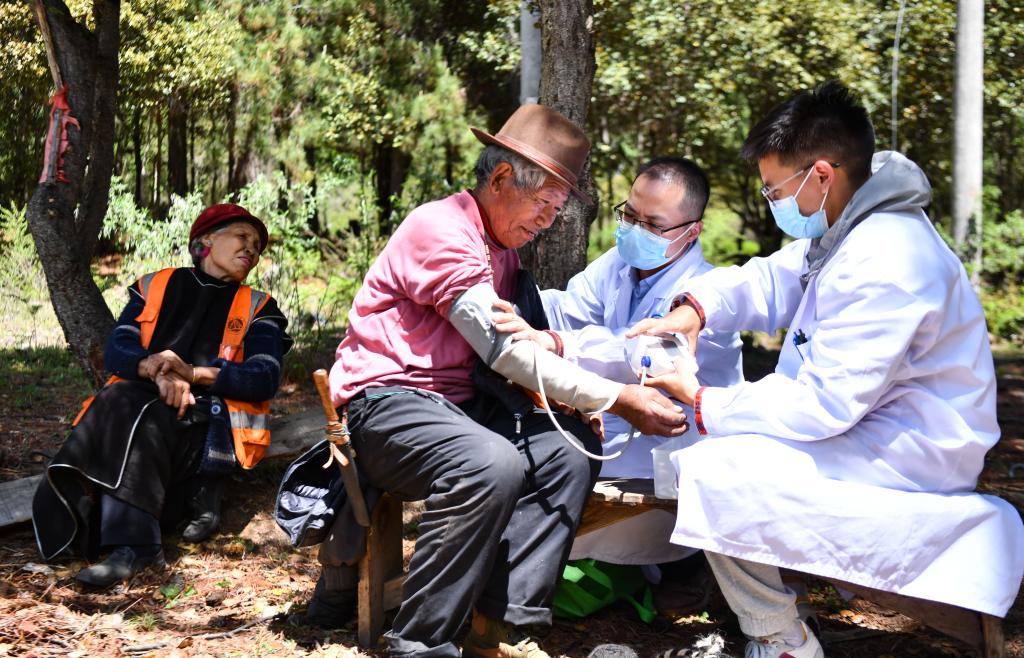 2023年6月12日,广东援藏医生王振疆(右二)和本地医生尼玛益西(右一)在西藏米林市吞布容村,给村民普布多吉检查身体。 新华社记者 晋美多吉 摄