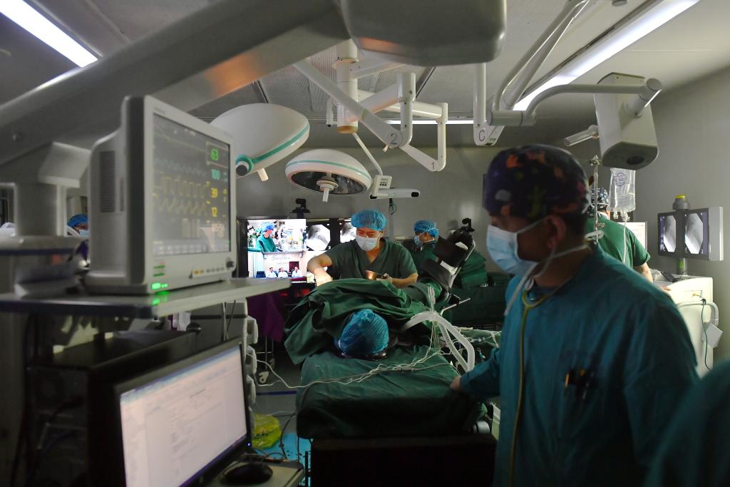 2021年4月19日,拉萨市人民医院骨科医生在北京积水潭医院专家远程指导下使用骨科机器人开展骨科手术。 新华社记者 孙瑞博 摄