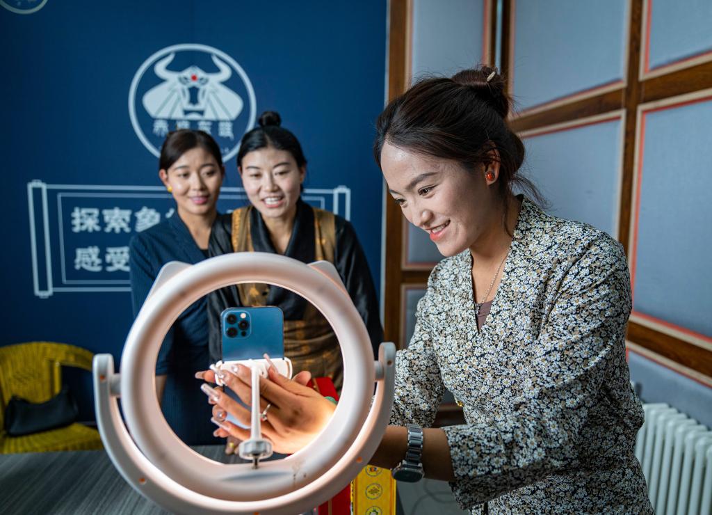 2023年10月29日,在西藏那曲巴青县“赤堆东雄”直播间,主播朗贡旺姆调试直播设备。新华社记者 孙非 摄