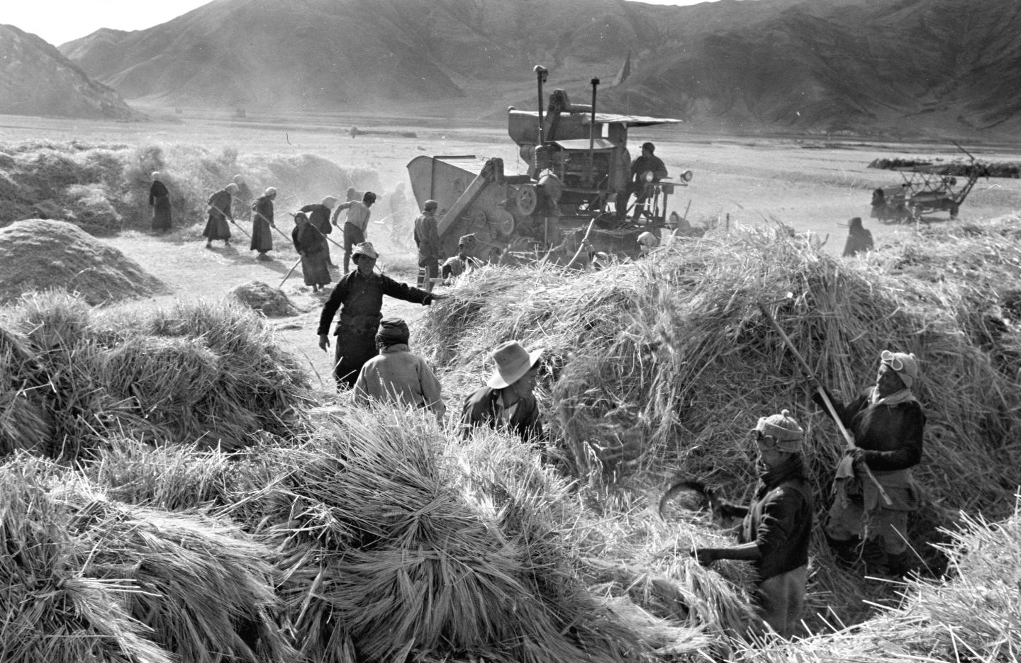 1965年,西藏国营澎波农场的藏族工人在使用农机脱粒。新华社记者 吴祖政 摄