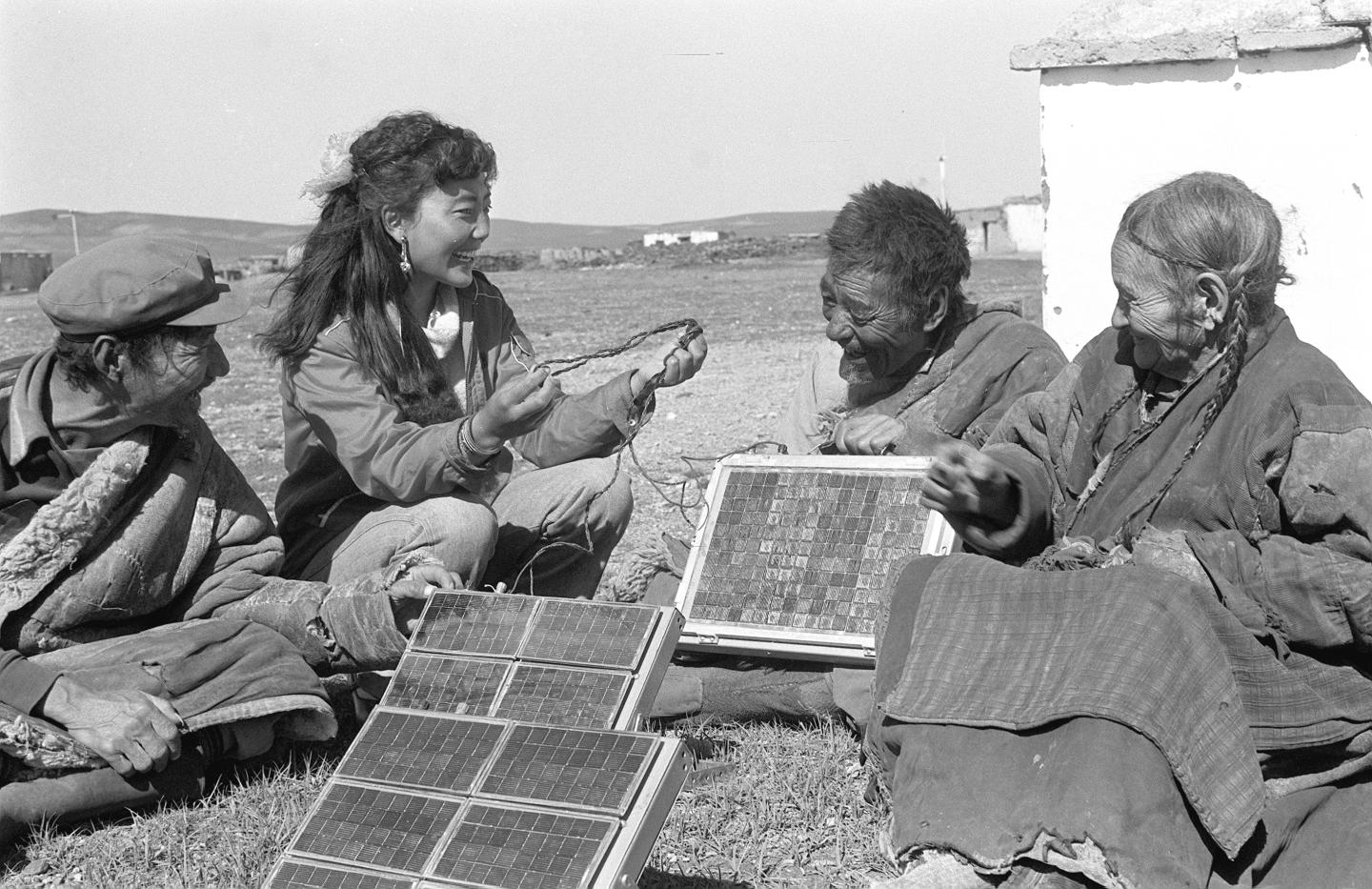 1986年3月,那曲地区(现为那曲市)科委工作人员齐美才央(左二)给牧民讲解太阳能电池使用方法。新华社记者 才龙 摄