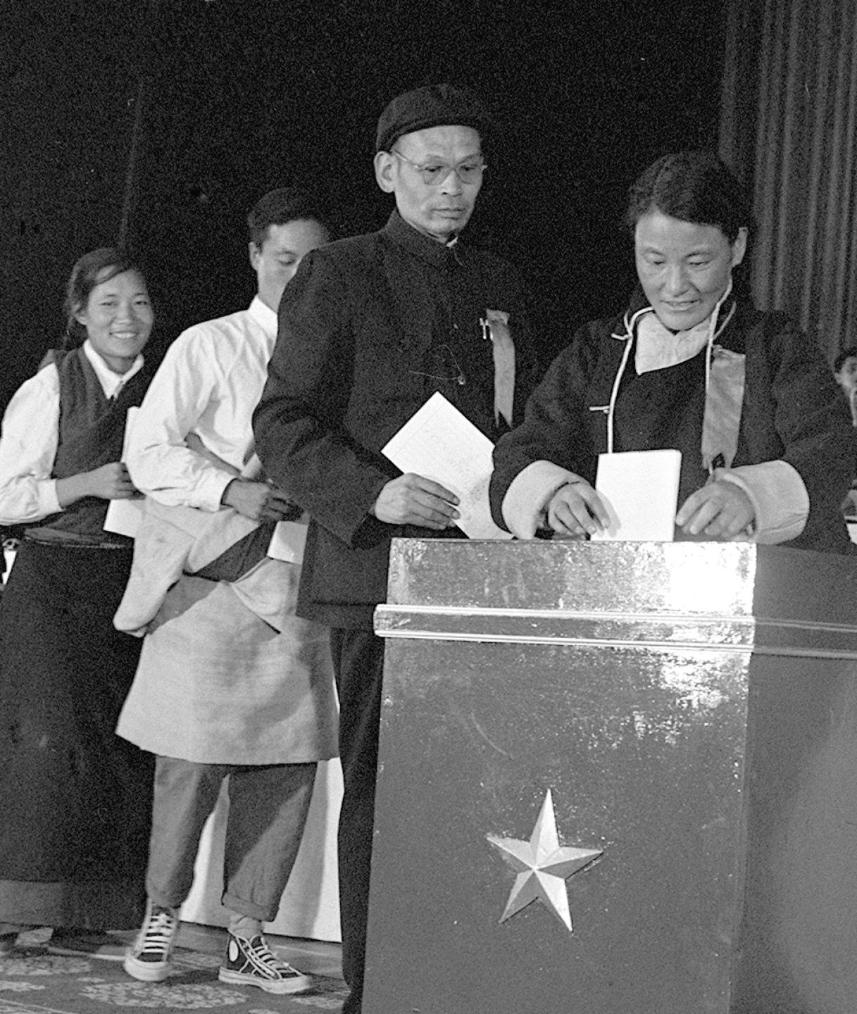 1965年9月,西藏自治区第一届人民代表大会第一次会议的代表次仁拉姆(右一)正在投票。新华社记者袁克忠摄