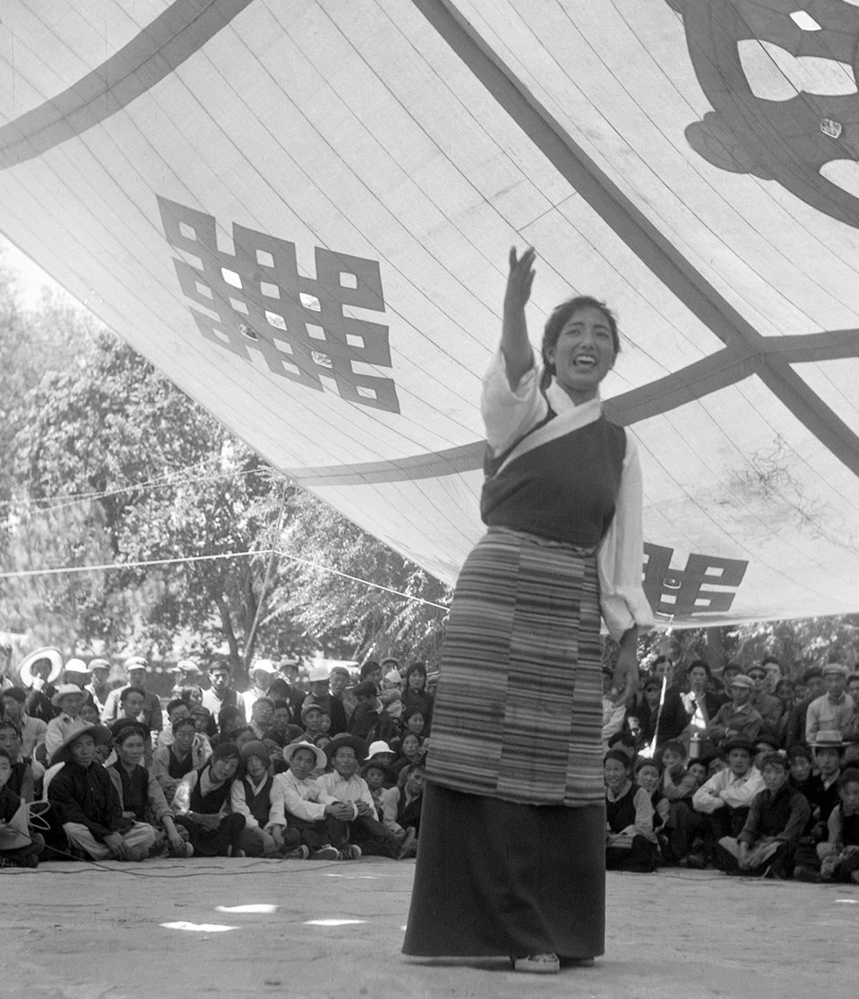 1965年10月,在西藏拉萨各族各界群众庆祝自治区成立联欢会上,西藏文化工作队队员雍西在演出。新华社记者 林枫 摄