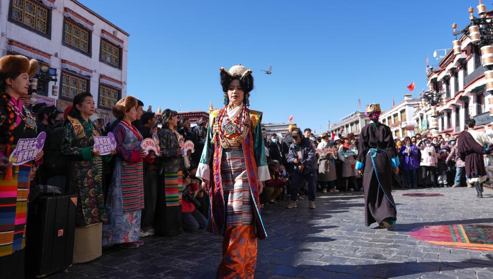 2025年1月3日,“拉萨新年服饰秀”上模特在拉萨八廓街巡游。新华社记者 晋美多吉 摄