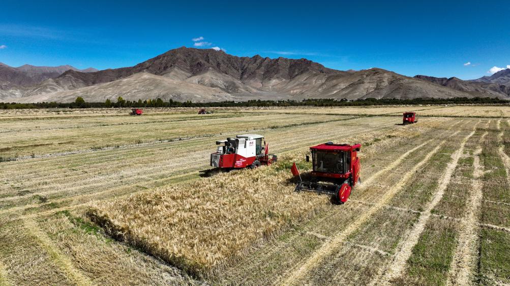 2022年9月19日,西藏日喀则市江孜县热索乡努康村农机合作社的村民集中对村里三千多亩耕地进行机械化收割。新华社记者 晋美多吉 摄