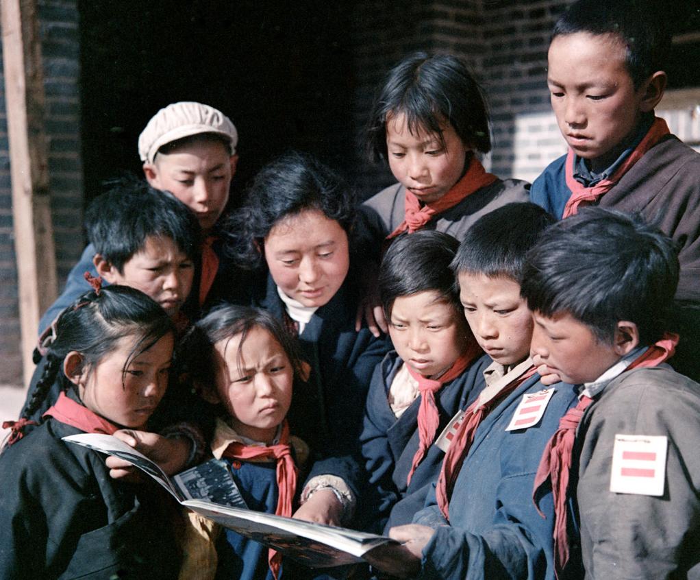 1965年9月,西藏昌都实验小学的老师和学生在看画报。新华社记者 马竞秋 摄