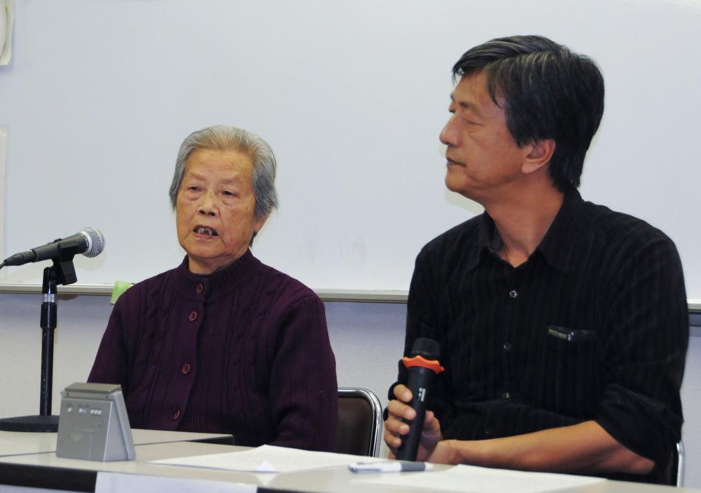 2014年12月7日,艾义英(左)在日本大阪参加证言集会,讲述自己在南京大屠杀中的亲身经历。新华社记者 马兴华 摄