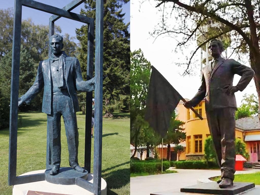 拼版照片:位于丹麦奥胡斯(左)和中国南京的辛德贝格雕像。