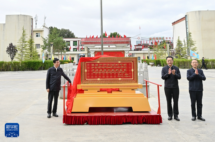 8月23日上午,受习近平总书记嘱托,带着党中央的亲切关怀和全国人民的深情祝福,中央代表团部分成员在日喀则看望慰问各族干部群众。这是王沪宁和中央代表团部分成员向日喀则市赠送贺匾。新华社记者 殷博古 摄