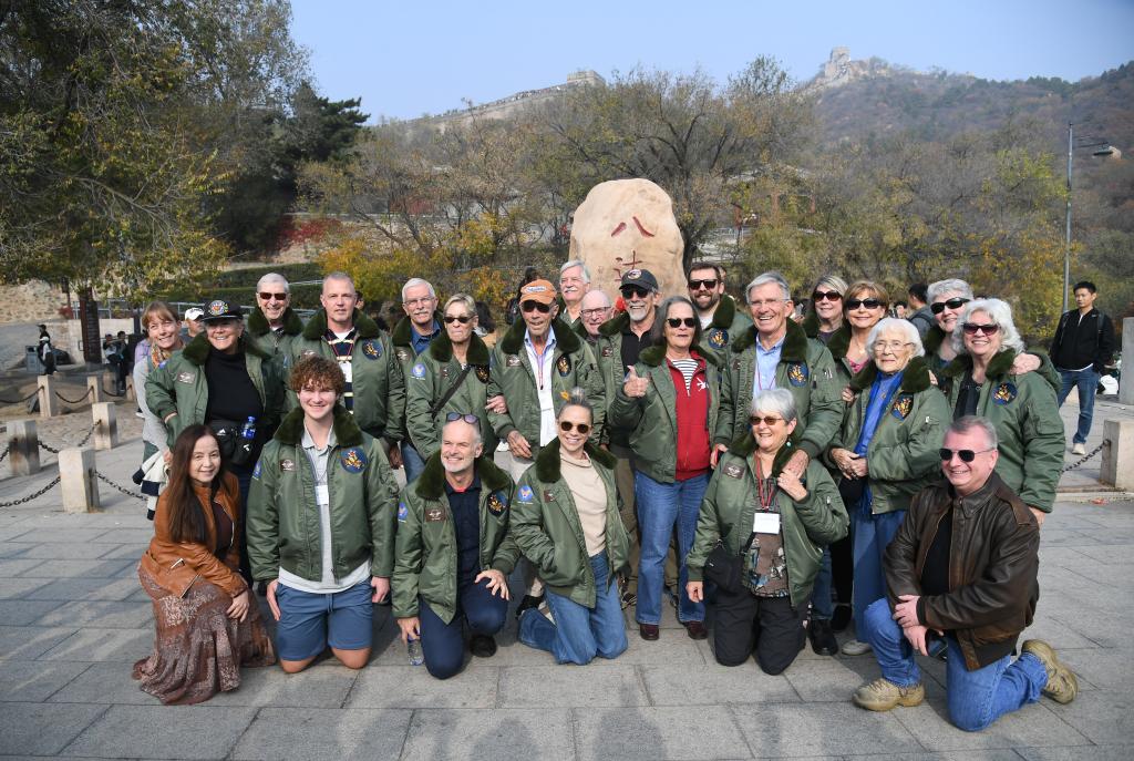 2023年10月29日,飞虎队老兵莫耶一行人在北京八达岭长城合影留念。 新华社记者 任超 摄