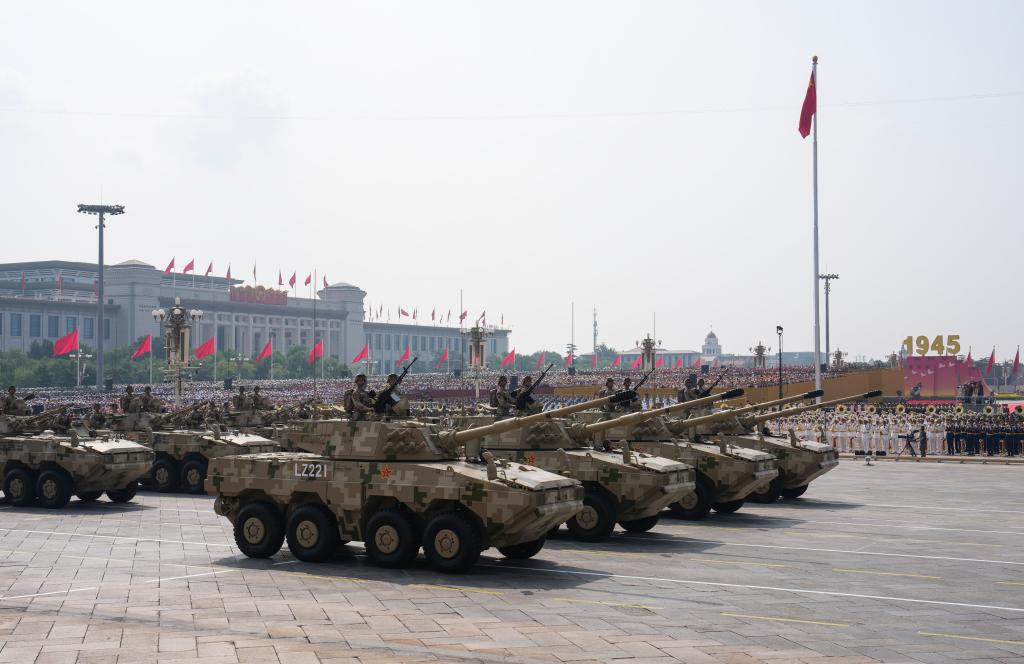 3日上午,由两栖轮式装甲步兵战车、两栖轮式装甲突击车和两栖轮式自行榴弹炮车组成的两栖突击方队通过天安门广场,接受党和人民检阅。