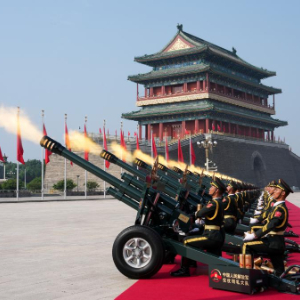 9月3日,纪念中国人民抗日战争暨世界反法西斯战争胜利80周年大会在北京天安门广场隆重举行。这是礼炮在天安门广场鸣响。新华社记者 牟宇 摄