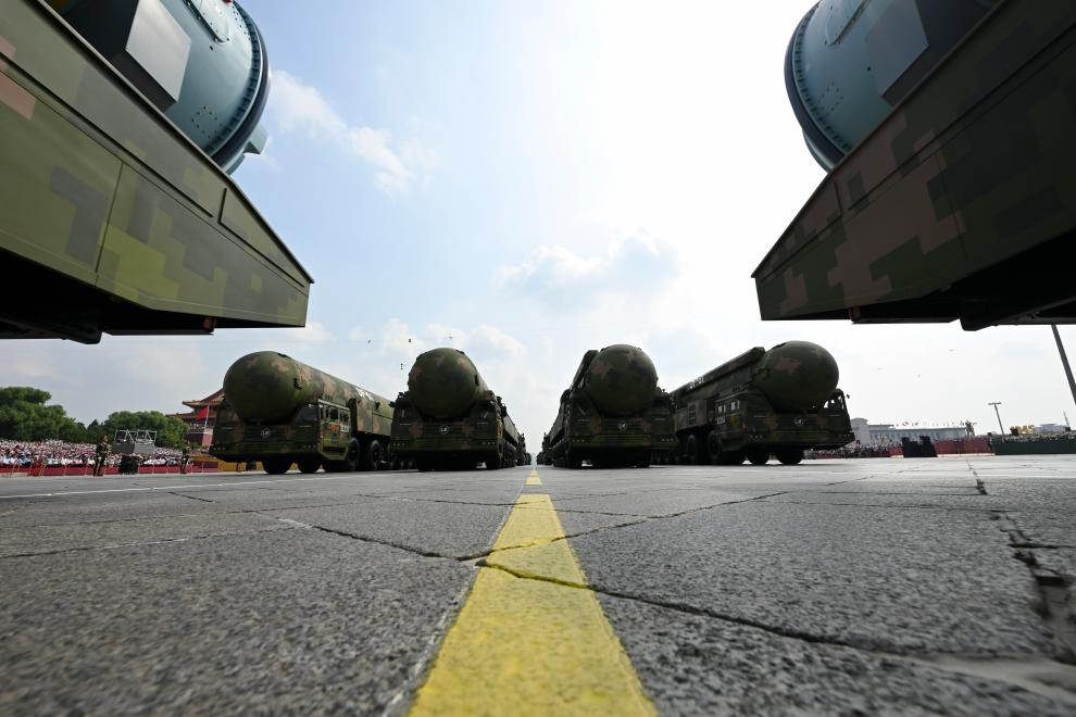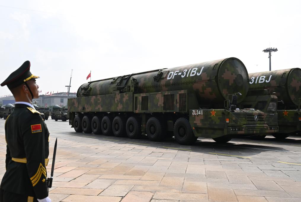 9月3日,纪念中国人民抗日战争暨世界反法西斯战争胜利80周年大会在北京隆重举行。这是核导弹第一方队接受检阅。新华社记者 肖艺九 摄