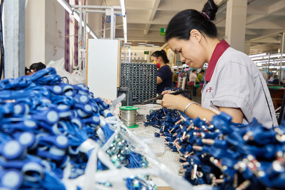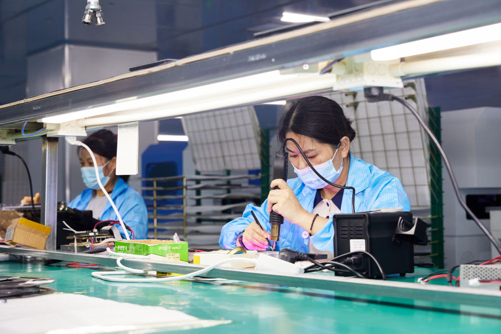 在广西都安瑶族自治县的深圳宝安—河池都安粤桂协作产业园,工人在电子生产线上工作。