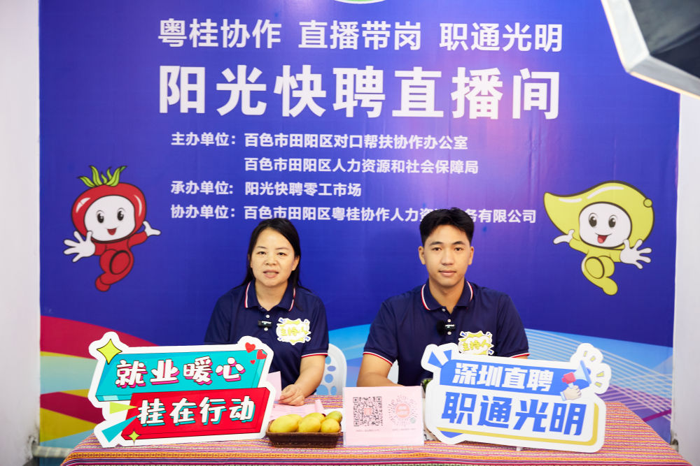 在广西百色市田阳区老乡家园"阳光快聘"零工市场,工作人员正在进行直播带岗。