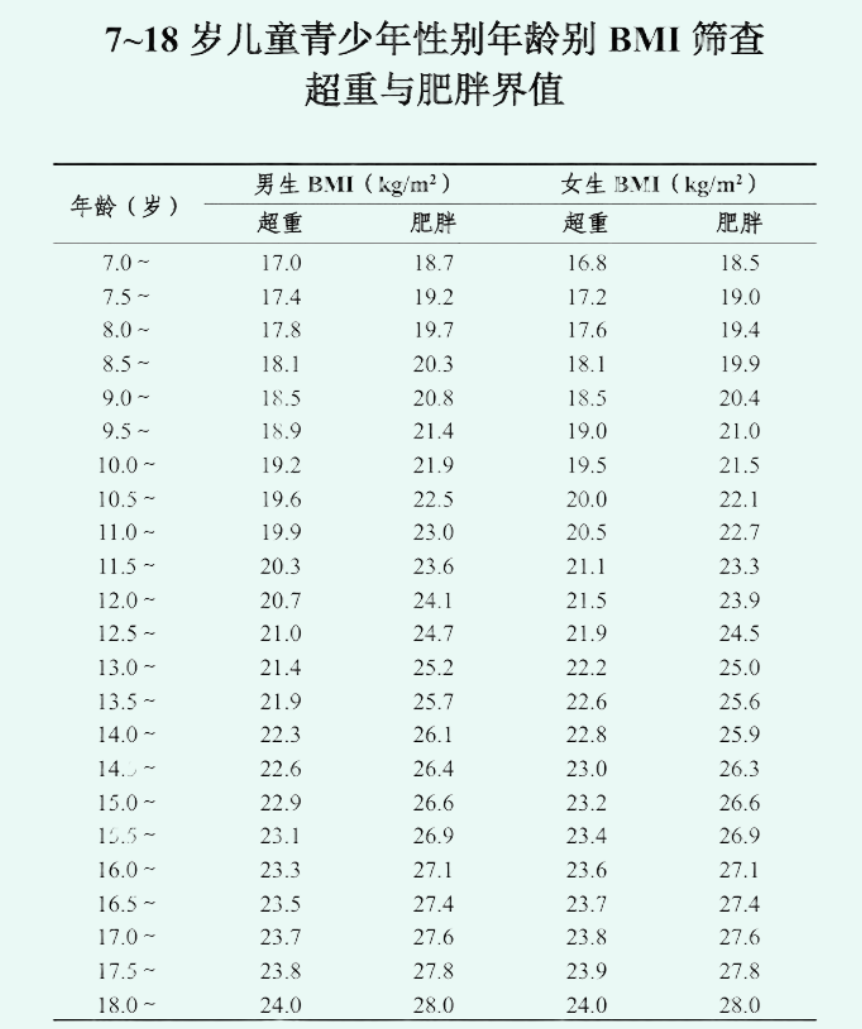 7~18岁儿童青少年以性别年龄别BMI作为筛查超重肥胖标准,家长可以借助对照表来帮孩子初步判断是否超重或肥胖。
