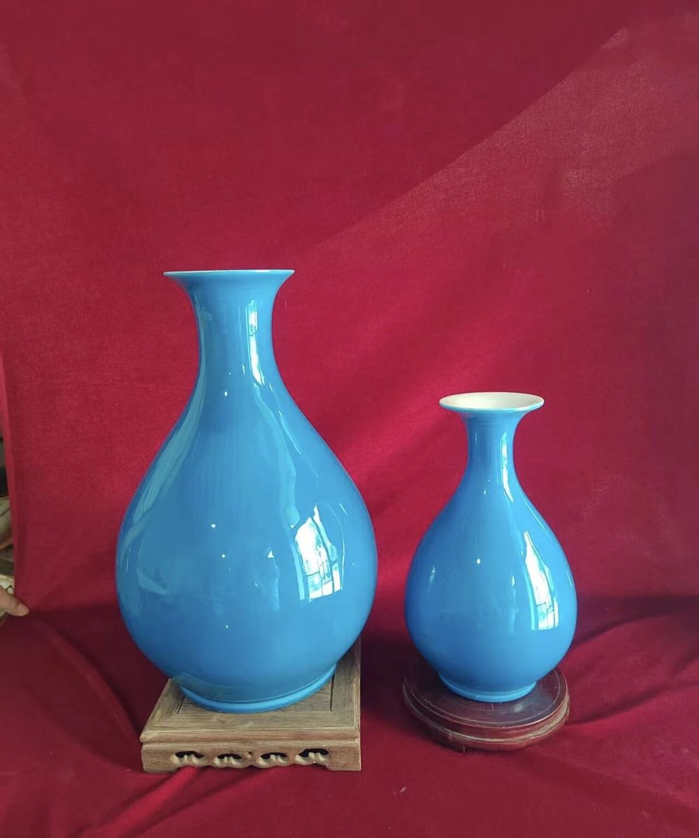 葛原生制作的孔雀蓝玉壶春瓶。受访者供图
