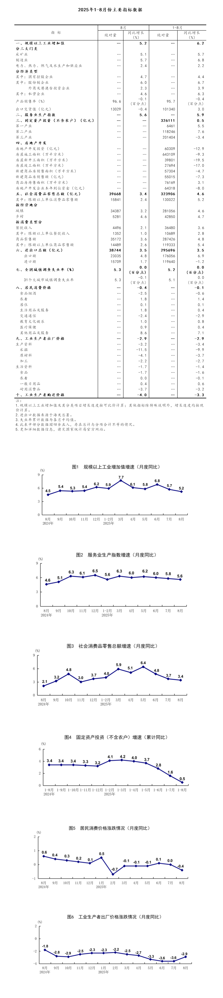 8月份,社会消费品零售总额39668亿元,同比增长3.4%;环比增长0.17%。按经营单位所在地分,城镇消费品零售额34387亿元,同比增长3.2%;乡村消费品零售额5281亿元,增长4.6%。按消费类型分,商品零售额35172亿元,增长3.6%;餐饮收入4496亿元,增长2.1%。基本生活类和部分升级类商品销售增势良好,限额以上单位日用品类、粮油食品类、体育娱乐用品类商品零售额分别增长7.7%、5.8%、16.9%。消费品以旧换新政策效果继续显现,限额以上单位家具类、家用电器和音像器材类、文化办公用品类、通讯器材类商品零售额分别增长18.6%、14.3%、14.2%、7.3%。1-8月份,社会消费品零售总额323906亿元,同比增长4.6%。全国网上零售额99828亿元,同比增长9.6%。其中,实物商品网上零售额80964亿元,增长6.4%,占社会消费品零售总额的比重为25.0%。1-8月份,服务零售额同比增长5.1%。其中,文体休闲服务类、旅游咨询租赁服务类、交通出行服务类零售额较快增长。