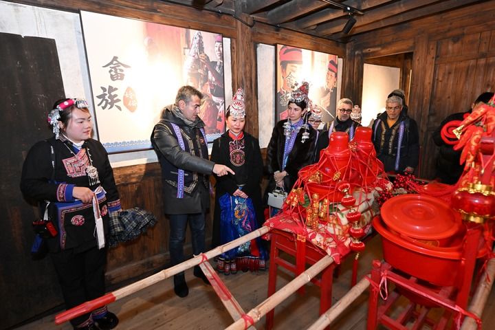 2025年1月20日,意大利客人在霞浦县半月里村参观畲族婚俗馆。