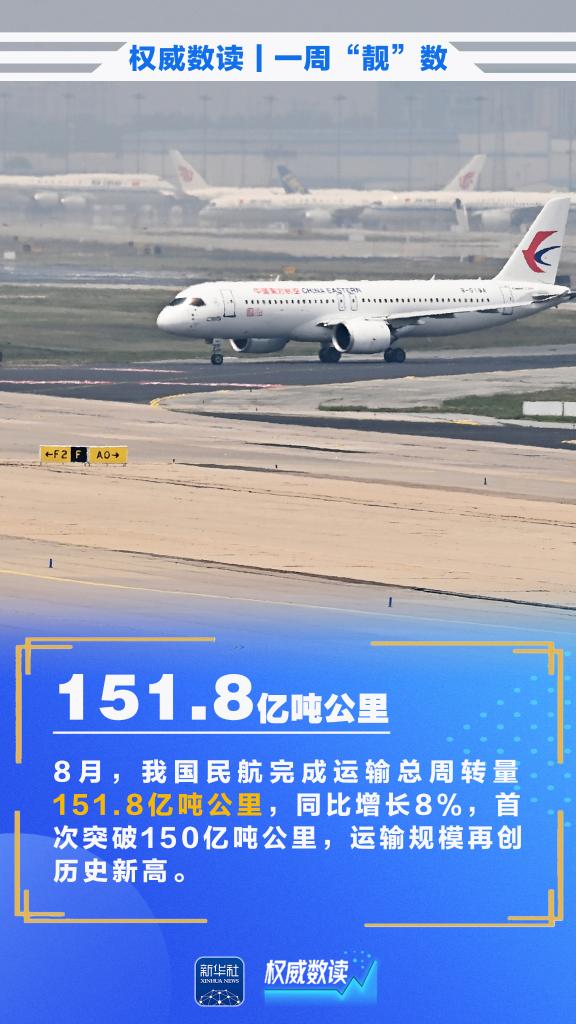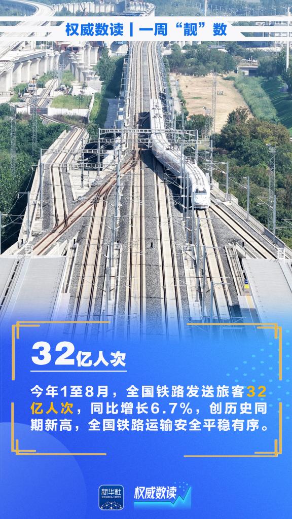 8月我国民航完成运输总周转量151.8亿吨公里,运输规模再创历史新高;今年前8个月全国铁路发送旅客32亿人次,同比增长6.7%,创历史同期新高;2024年全国优良天数比例达到87.2%,比2020年上升2.4个百分点……本周这些数据,最值得关注!