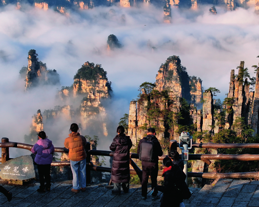 游人在张家界国家森林公园天子山欣赏云海景观(2024年1月3日摄)。新华社发(吴勇兵摄)