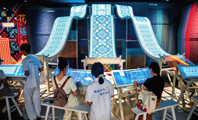 在湖南省怀化市五溪非遗园,游客在体验数字化织锦(2025年9月16日摄)。陈思汗摄/本刊